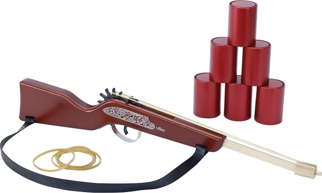 Saa väikeseks kauboiuks selle stiilse VILACi puidust püssiga! Komplekt sisaldab kummipüssi, 20 kummirõngast ja 6 mini plekkpurki lõbusa ja ohutu märkilaskmise jaoks. Suurepärane täpsusmäng, arendab motoorikat ja võistlusvaimu lastele alates 5. eluaastast.