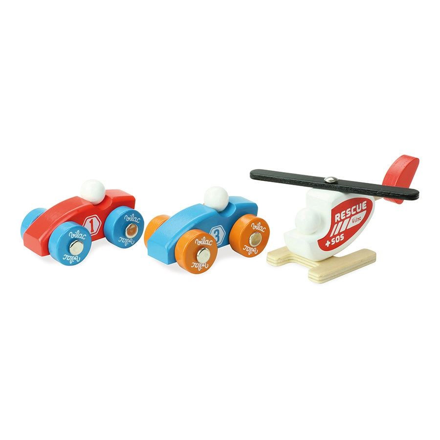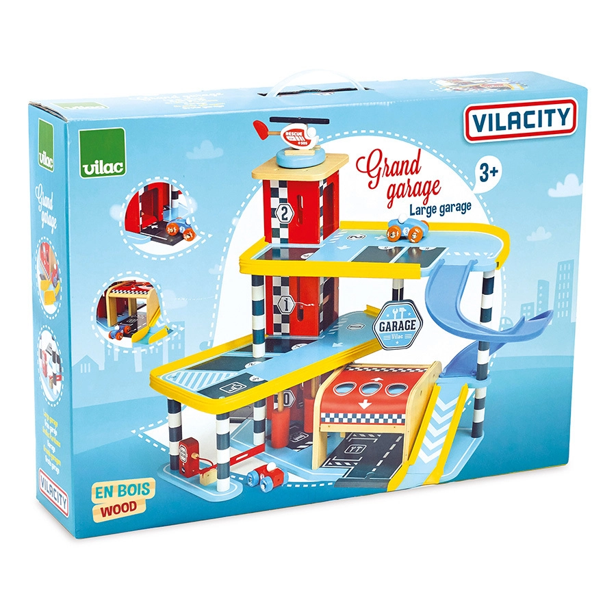 Avasta lõbu VILAC Vilacity puidust garaažiga! See suur mitmekorruseline garaaž pakub töötavat lifti, tõstetavaid uksi, parandõkkepuud, kütusepumba ja pesuharju. Komplektis on 2 autot ja helikopter, täielik ühilduvus kollektsiooniga VILACITY ning keskkonnasõbralik tootmine.