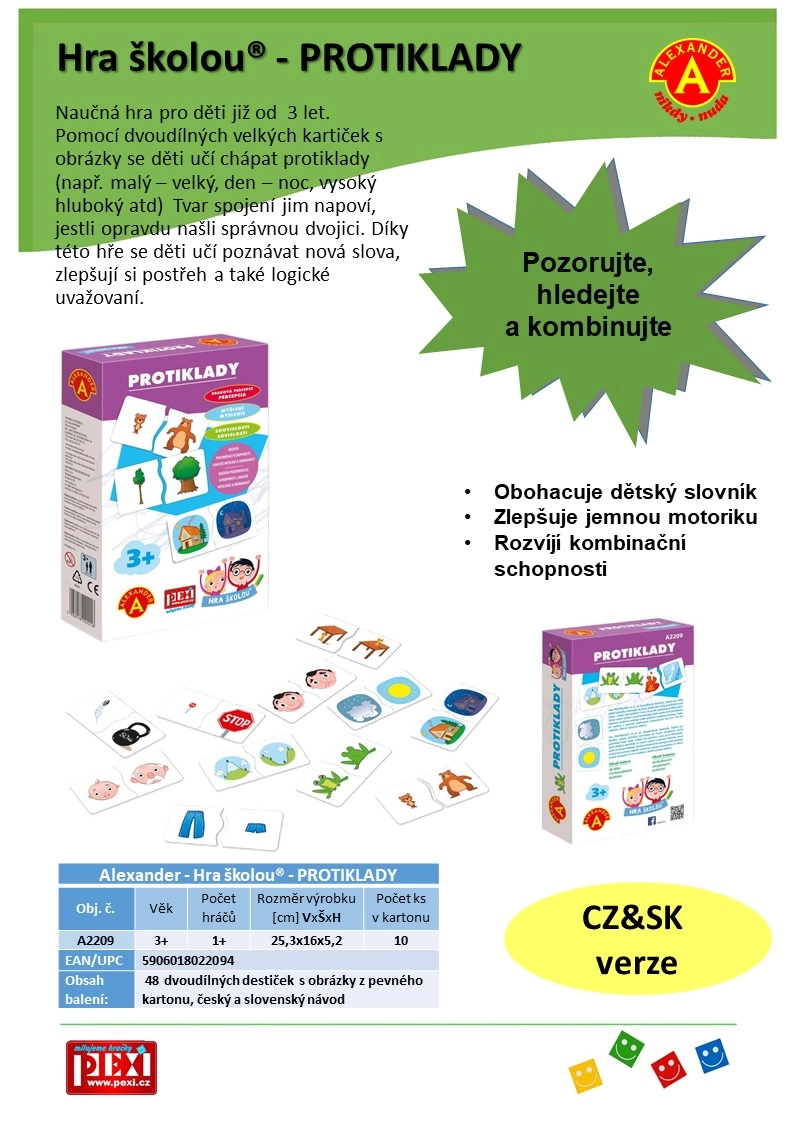 - 48 kaheosaliste piltidega plaati, tšehhi- ja slovakikeelne mängujuhend