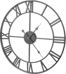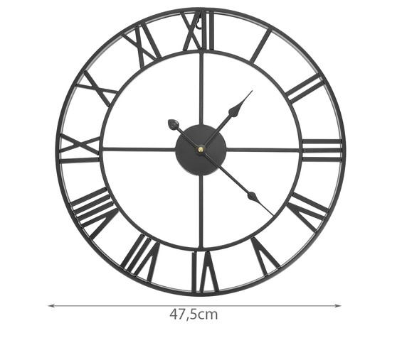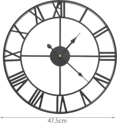Stiilsed metallist seinale paigaldatavad loft-kellad diameetriga 47 cm ühendavad avatud raami rooma numbritega ja musta viimistluse. Kvaliteetne metallkonstruktsioon, kerged alumiiniumist osutid ja täpne kvartsmehhanism pakuvad elegantset välimust, suurepärast loetavust ja lihtsat riputamist konksu abil – ideaalne elutuppa, kontorisse ja esikusse.