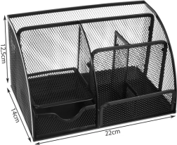 See praktiline korraldaja aitab korrastada kõik sinu kontoritarbed ja hoida tööpinna selge. Tugev metallist (rauast) võrgudisainiga konstruktsioon on vastupidav ja kauakestev, taludes igapäevast kasutust nii kodus kui tööl. Tänu kompaktsetele mõõtmetele mahub see igale lauale, olles samas üllatavalt ruumikas.