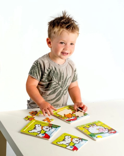 Tükid on paigutatud puidust alusele freesitud servaga, mis hõlbustab väikeste käekeste käsitsemist.