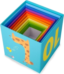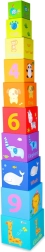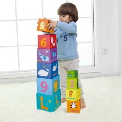 Need värvilised klotsid sisaldavad numbreid, loomi ja ingliskeelseid sõnu, aidates õppimisel ja kognitiivsete oskuste arengul.