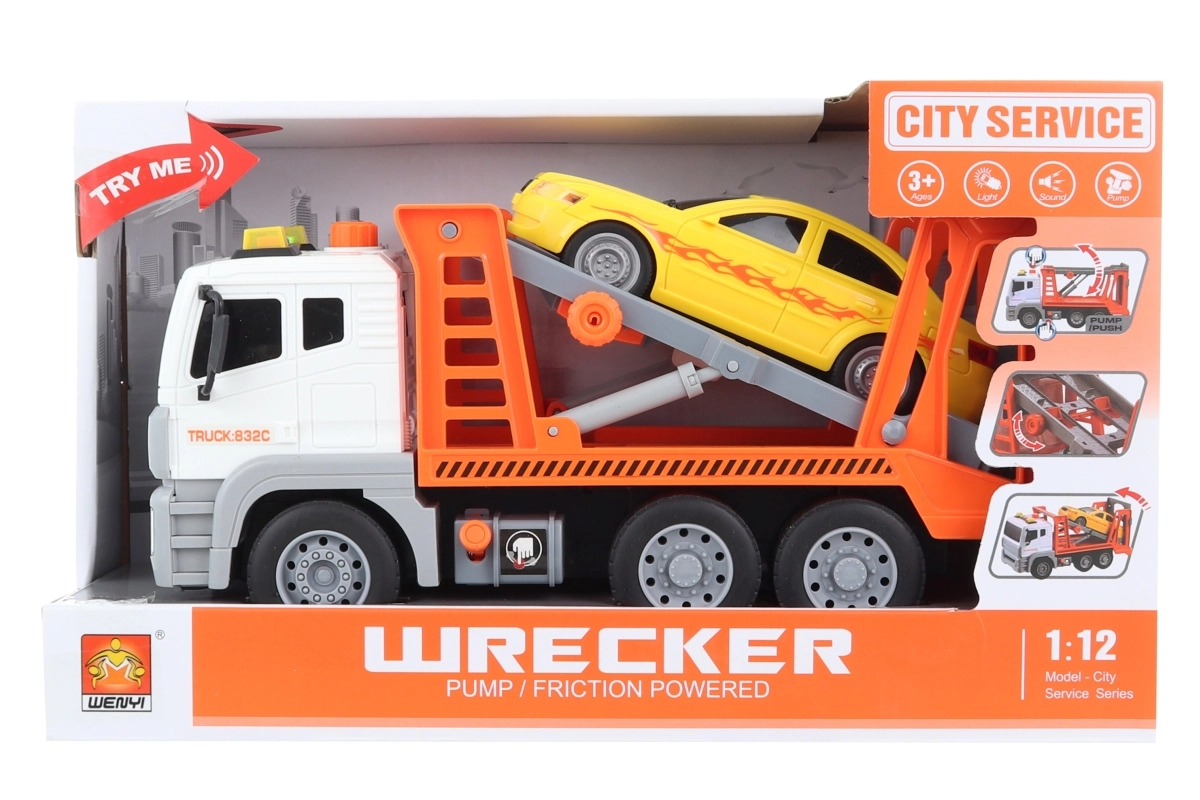 Lõbus plastikust autovedaja mõõtkavas 1:12 rõõmustab väikeseid juhte alates 3. eluaastast. Nupu vajutamisel teeb see realistlikke helisid ja süttib, toite annavad pakendis olevad 3× AG13/LR44 patareid. Ideaalne mänguasi kujutlusvõime ja motoorika arendamiseks.