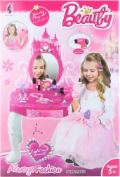 Ühe nupuvajutusega süttivad tuled ja hakkab mängima meloodia, lisades mängule ehedust. Komplekti kuulub ka mugav plastikust taburet. Kõik, mida teie laps vajab ilumänguks, on olemas!