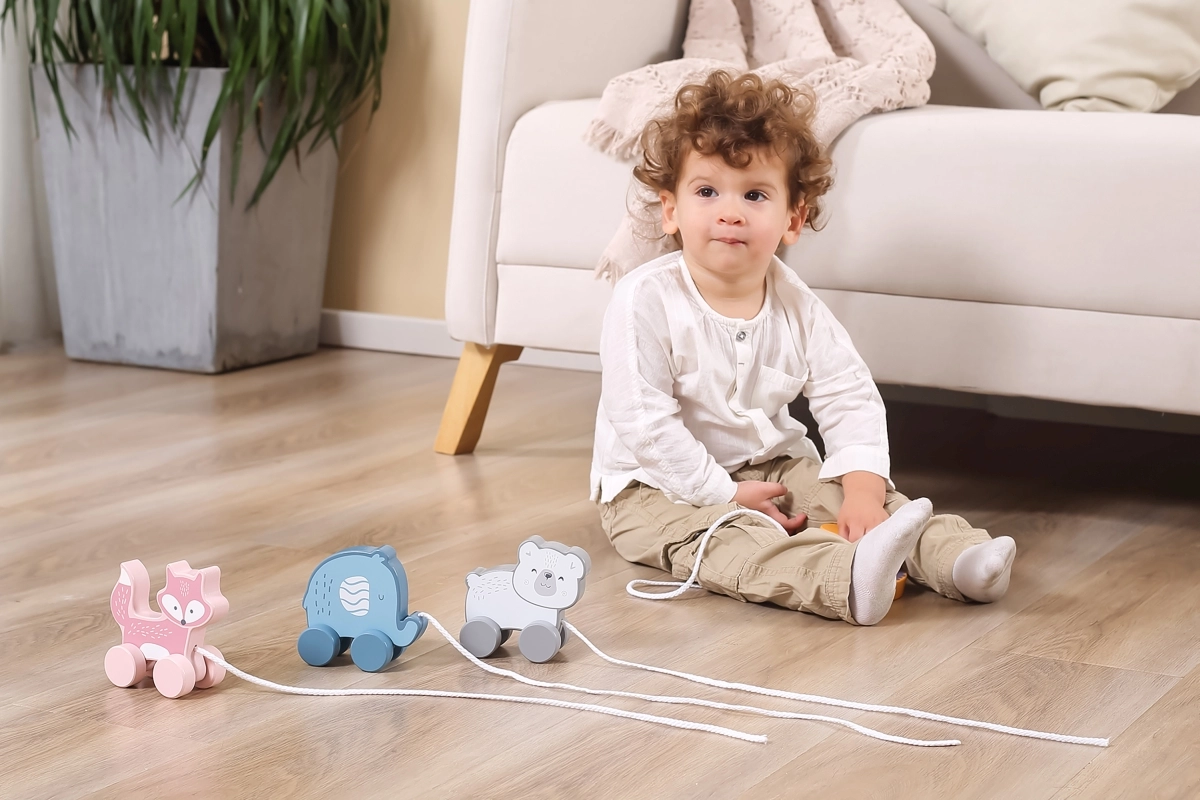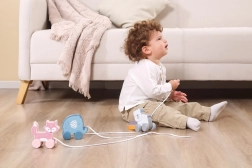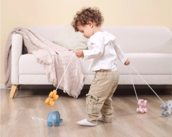 Tänu liikuvatele ratastele ja tõmbamisvõimalusele toetab mänguasi füüsilist arengut ja koordinatsiooni.