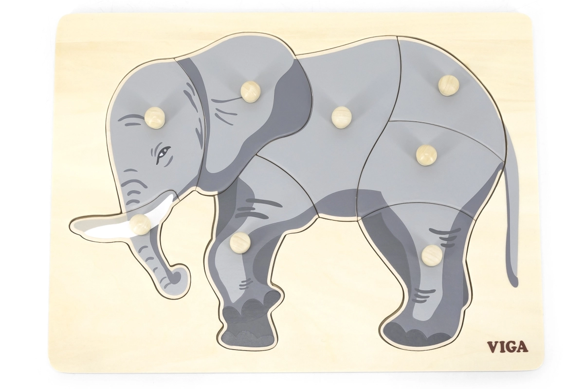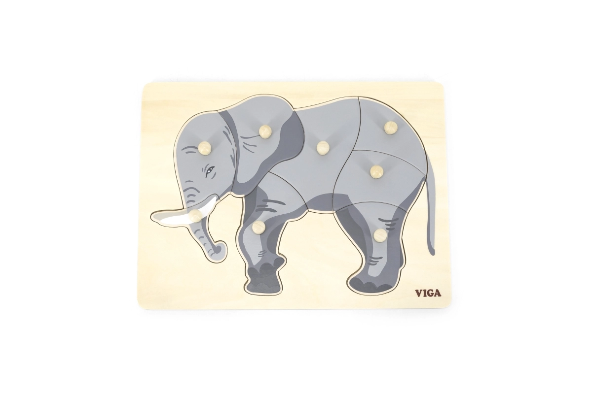 See kaunis puidust pusle elevandi motiiviga on ideaalne laste kognitiivsete oskuste ja peenmotoorika arendamiseks. Kõik tükid on varustatud nuppudega, mis võimaldavad lastel neid kergesti käsitseda.