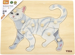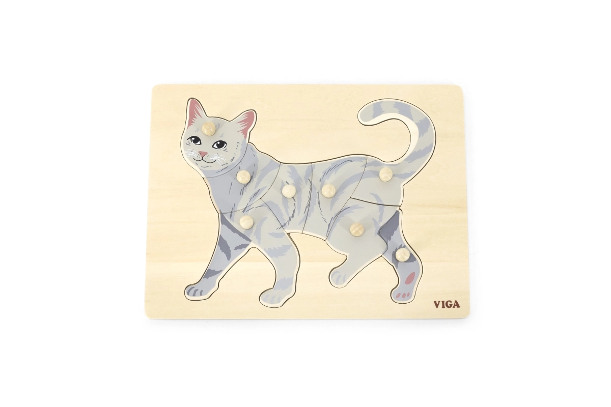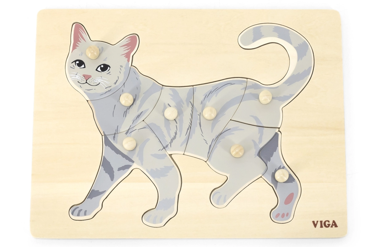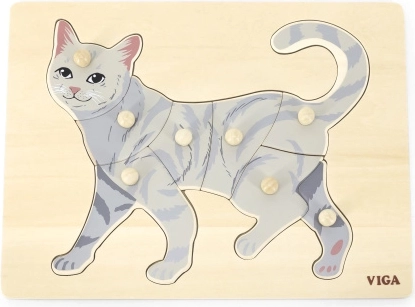 Lapse ülesanne on kokku panna kassi pilt mitte ainult illustratsiooni, vaid ka üksikute tükkide kuju järgi. Nupptüüpi käepidemed hõlbustavad haaramist väikeste sõrmedega ja toetavad käe õiget juhtimist. Tugev puidust alus hoiab tükke kindlalt paigal ja peab vastu igapäevasele kasutusele.