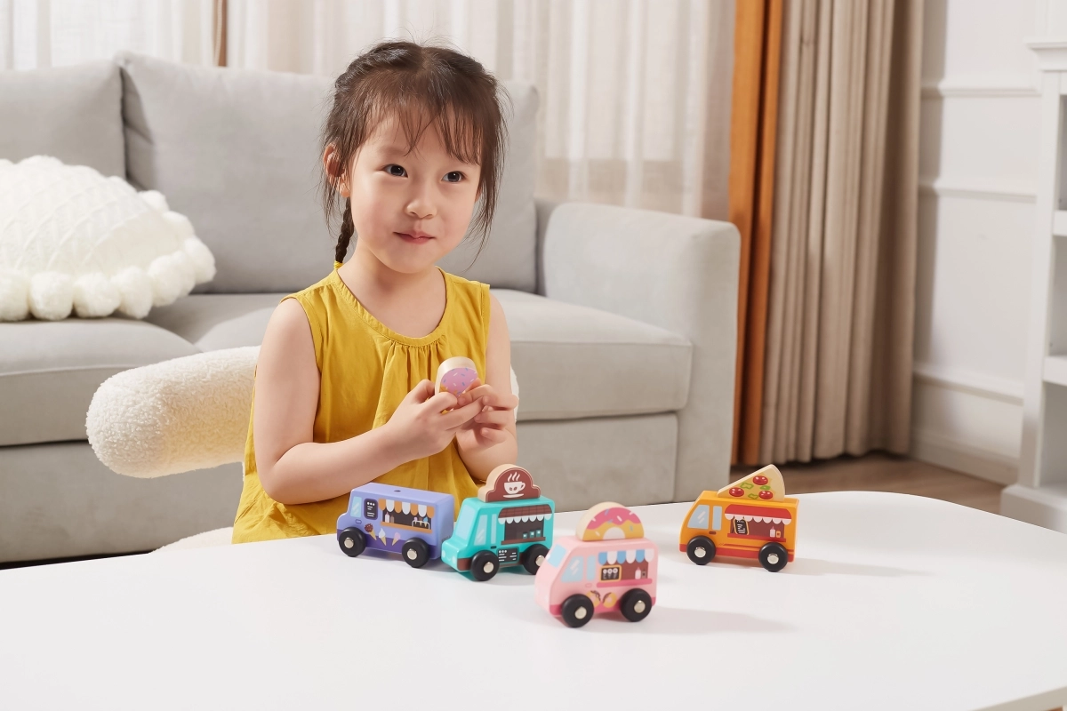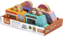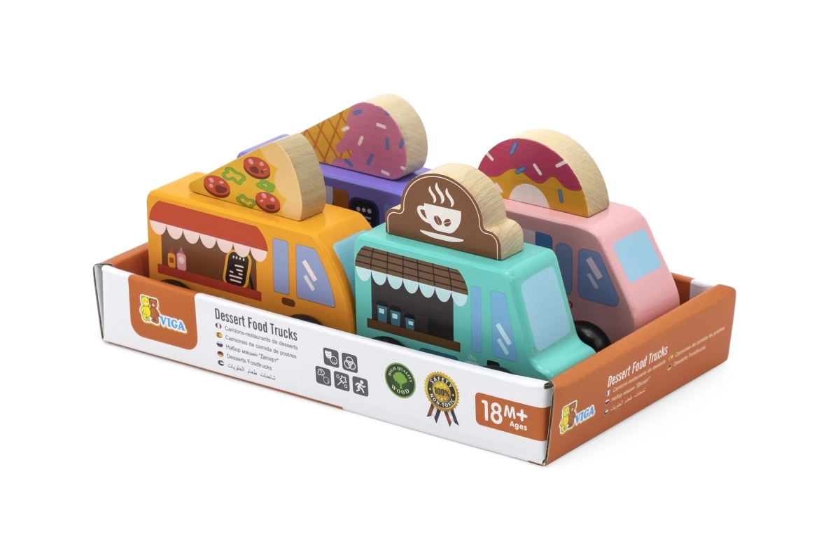 Viga puidust toiduveokite komplekt toob neli armsat ratastel sõidukit pastellvärvides koos detailsete trükistega. Igal veokil on temaatiline bänner – pitsa, kohv, jäätis ja sõõrikud – mida saab vabalt vahetada, et lapsed saaksid luua oma lugusid ja müügikohti. Kvaliteetne puit ja mittetoksilised värvid tagavad turvalise ja kauakestva mängu.