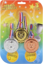 Premeeri väikseid võitjaid stiilselt kolme medali komplektiga – kuldne, hõbedane ja pronksine. Igaühe läbimõõt on umbes 6 cm ning need sobivad lastele alates 3. eluaastast. Ideaalne võistlusteks, lasteaedadesse, sünnipäevamängudeks ja pereturniirideks.