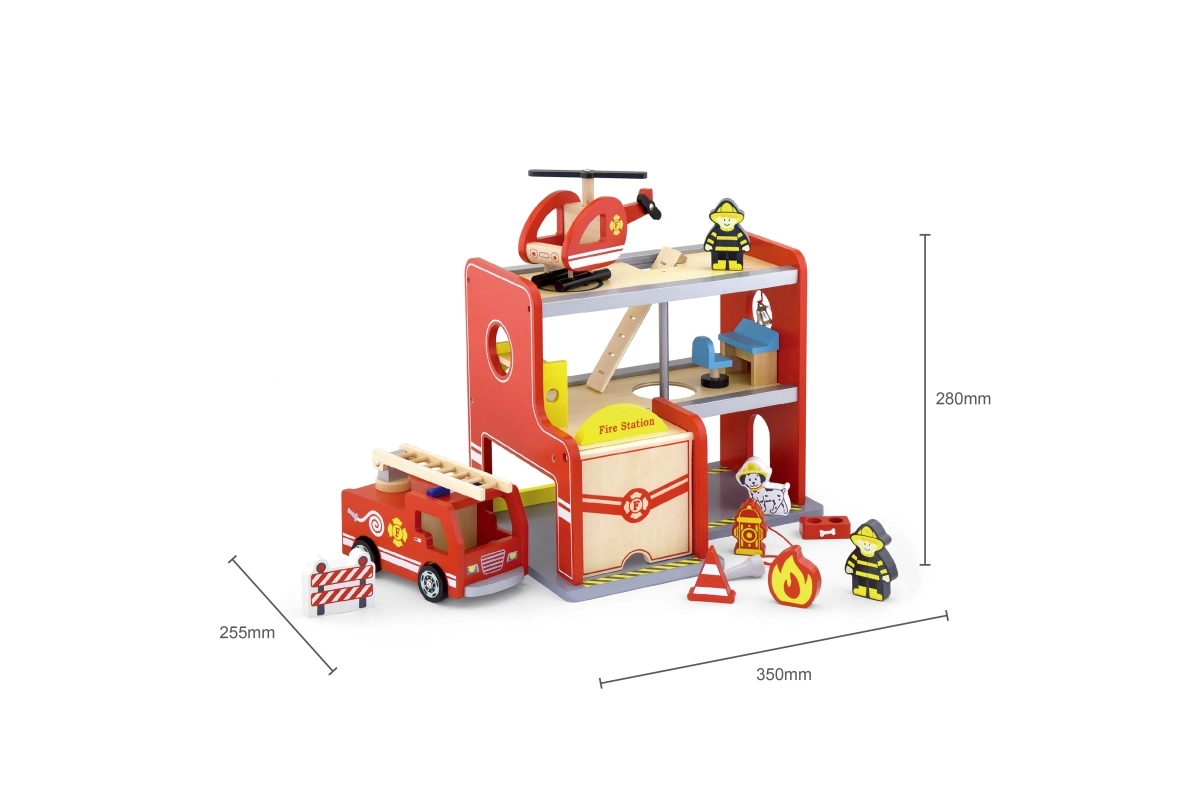 Pakendis on kõik, et kohe mängima hakata: depoohoone, 2 tuletõrjujat, helikopter, tuletõrjeauto, hüdrant, narivoodi, tool, juhtpult ja redel. Materjalid ja värvid on ohutud ja mürgivabad, et lapsed saaksid muretult mängida. Ideaalne kingitus, mis rõõmustab ja peab vastu.