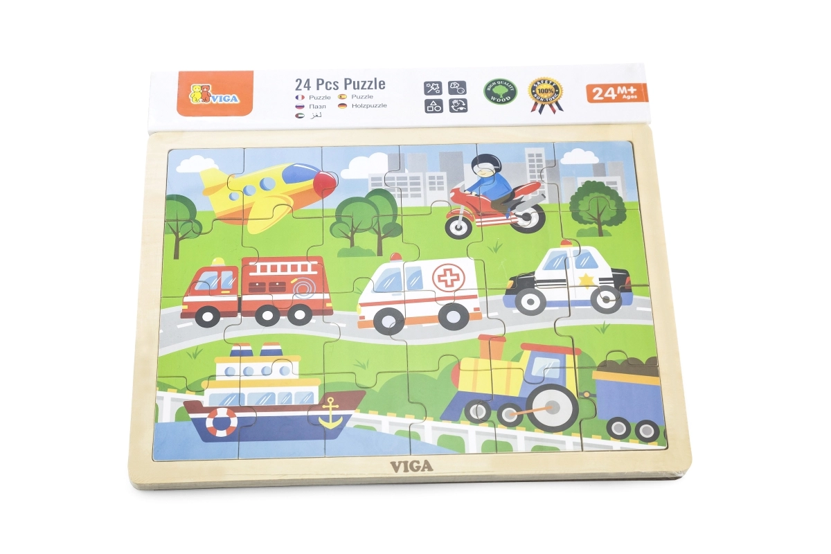 See puidust pusle transpordivahendite piltidega on suurepärane valik esimeseks “suuremaks” pusleks. Tänu 24 tükile pakub see just parajat väljakutset – toetab keskendumist ning rõõmu valmis pildist mõõtmetega u 27,5 × 20 cm. Värvilised illustratsioonid sõidukitest (kiirabi, tuletõrjeauto, politseiauto, laev, lennuk jm) innustavad lapsi mängu kordama.