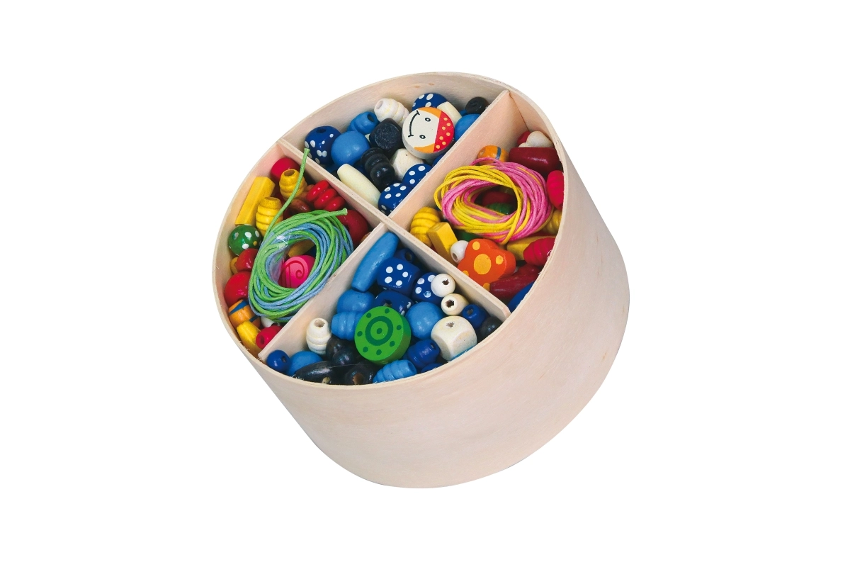 Komplektis on puidust karp vaheseintega, mis sobib suurepäraselt pärlite ja nööride hoidmiseks.