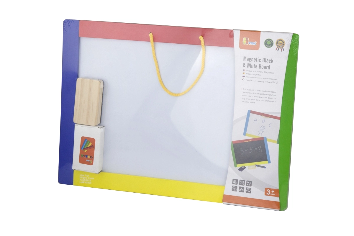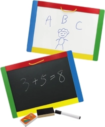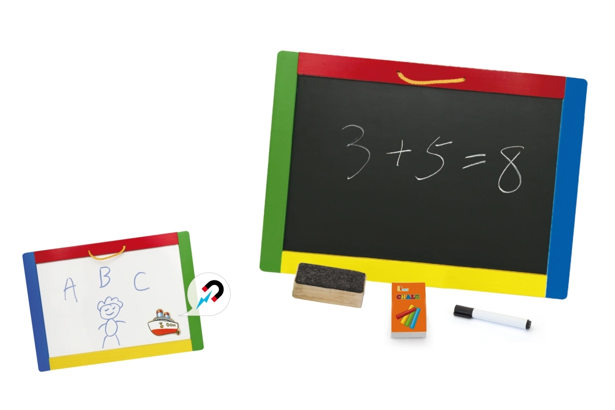 See universaalne tahvel ühendab kaks loovpinda ühes – must magnetiline pool kriitidele ja valge kuivkustutatav pool markerile. Lapsed saavad kirjutada, joonistada ning harjutada tähti ja numbreid; mustale poolele on lisaks lihtne kinnitada magneteid. Pakendis on kõik kohe kasutamiseks valmis: 4 kriiti, kuivkustutatav marker ja käsn.