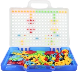 Kõik on paigutatud kaasaskantavasse kohvrisse, mille kaas toimib pegboardina, mistõttu on komplekti lihtne nii transportida kui ka korrastada. Suurepärane abivahend motoorika, käe-silma koordinatsiooni, loovuse ja kannatlikkuse arendamiseks.