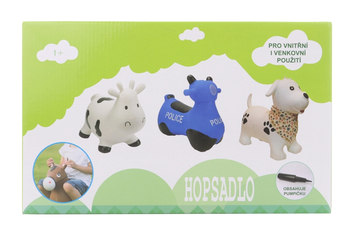 Lõbus kummist hüppeloom mootorratta kujul politseimotiiviga lastele alates 1. eluaastast. Toetab tasakaalu arendamist, suurt motoorikat ja koordinatsiooni, on stabiilne, vastupidav ja kergesti puhastatav. Komplektis on pump kiireks täispumpamiseks.