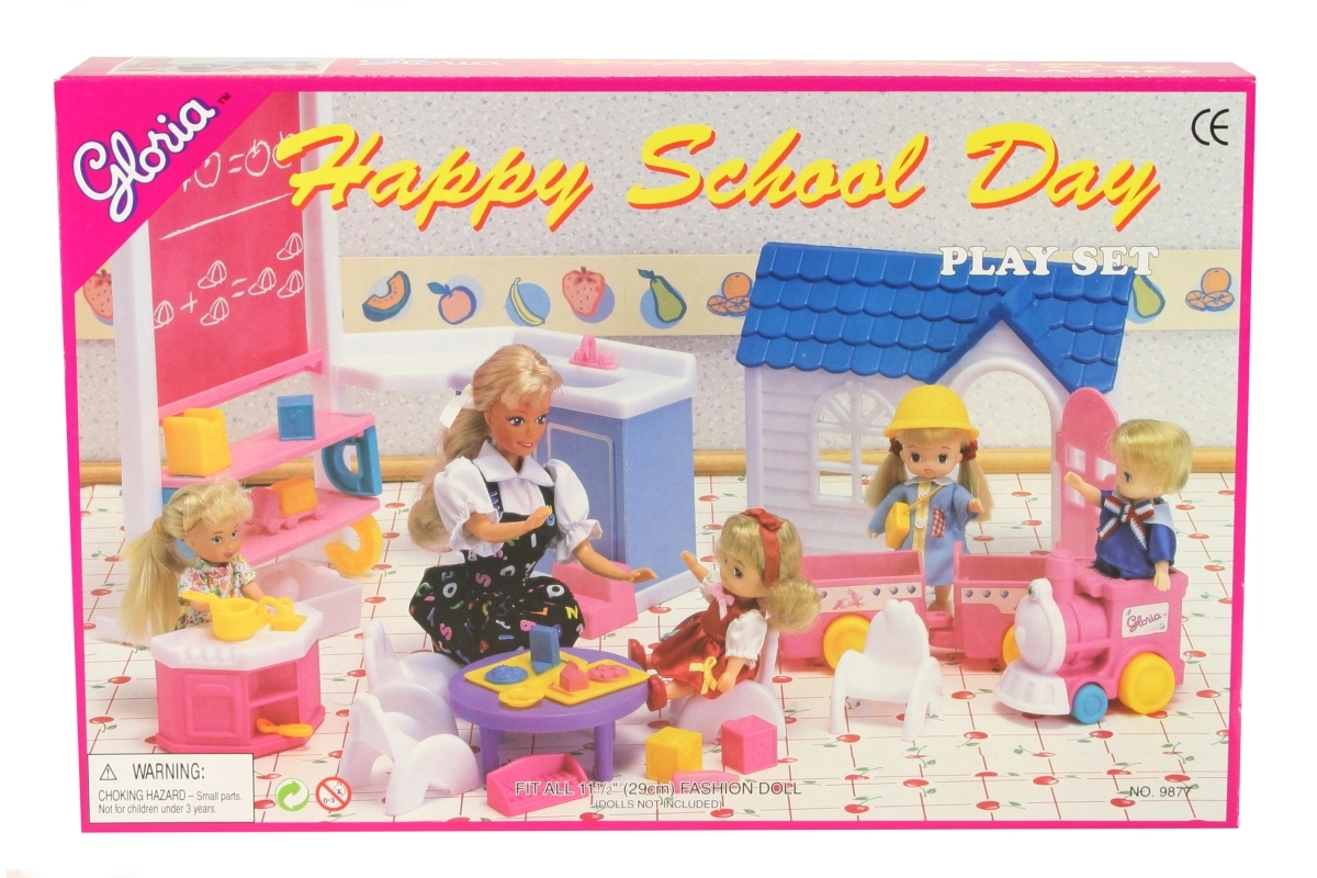 Loo nukkudele täiuslik mängukeskkond rikkalikult varustatud Glorie lasteaia komplektiga. Lapsed armastavad mängida lasteaeda realistlike elementidega, nagu tahvel riiulitega, toimiv kätepesukauss ja majake avanevate ustega. Komplekti kuuluvad ka rong, laud, toolid ning hulk väikseid lisasid, mänguasju ja nõusid – kõik loovateks stseenideks ja igapäevaseks mängurõõmuks.