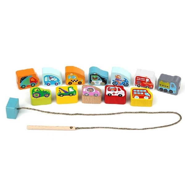 Cubika nöörile lükitavate sõidukite komplektis on 12 puidust elementi erinevate transpordimotiividega ning üks 45 cm pikkune nöör puidust pulgakesega. Lapsed saavad 8 kaasasoleva eeskuju abil treenida mälu ja käteosavust ning samal ajal nautida arendavat mängu.