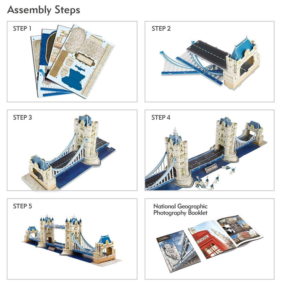 Avasta Londonit, ehitades ühe selle kuulsaima sümboli – Tower Bridge’i. National Geographicu sarja 3D-pusle CubicFunilt pakub realistlikku teostust, täpseid detaile ja meeldivat ehituskogemust ilma liimi vajaduseta. U umbes 3 mm paksune vaht koos laminaattrükiga tagab valminud mudelile vastupidavuse ja kauni välimuse.