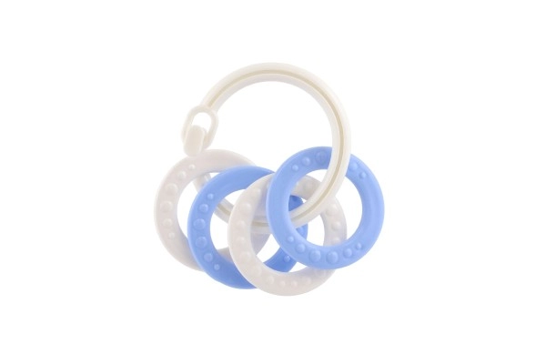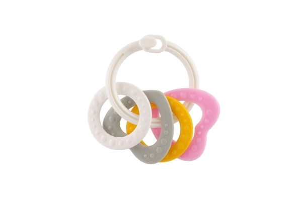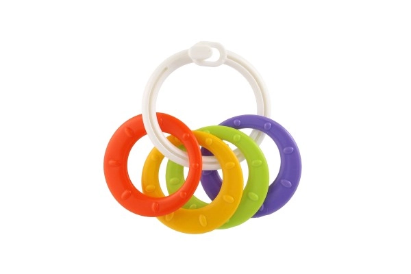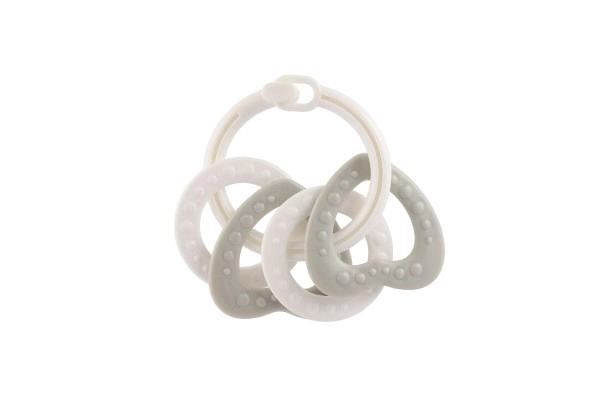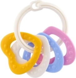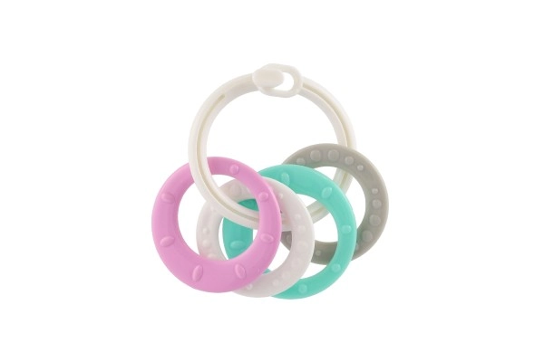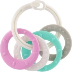 Sobib lastele alates 3. elukuust. See närimismänguasjade komplekt sisaldab värvilisi plastist rõngaid, mis on mitte ainult kerged, vaid aitavad kaasa ka peenmotoorika arengule. Tänu mitmekesistele struktuuridele ja vormidele pakub mänguasi mitut meelt stimuleerivaid kogemusi, mis on mõeldud lapse hammaste lõikumise perioodiks.