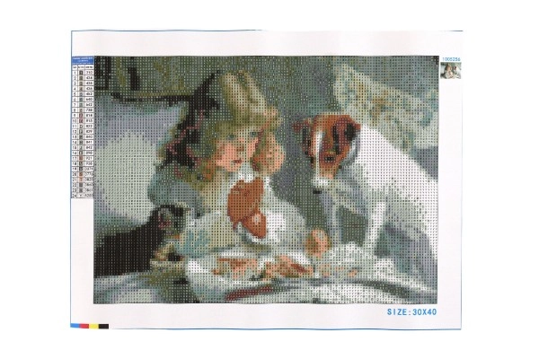Detailne motiiv tüdrukust ja koerakesest suuruses 30 × 40 cm särab valmides kaunilt ja mõjub igas interjööris raamitatuna eriti stiilselt.