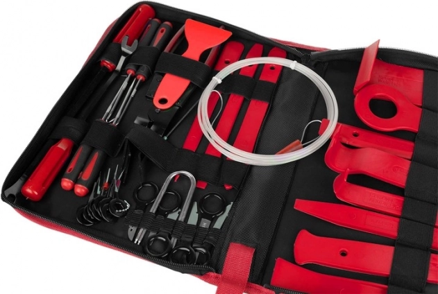 Komplektis: vutlar, 12× plastikkang/liistueemaldaja, klambrite tangid, 2× klambrite eemaldaja (22,5 cm ja 31 cm), 8× autoraadio võtmekomplekt, 11× pin-võti, 4× tihendikonks, lisasüsteem uste väljast avamiseks.