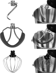 Komplektis on kolm erinevat otsikut: vispel, tainakonks ja segamislabidas. Need on hädavajalikud tööriistad täiuslike tainaste, kreemide ja sinu lemmikmaiuste valmistamiseks. Lisaks kuulub komplekti stiilne tarvikute komplekt: kondiitriprits, otsikud ja munade eraldaja.