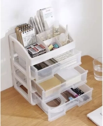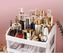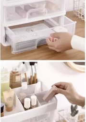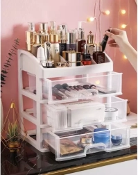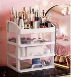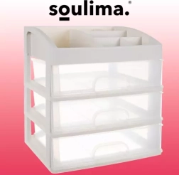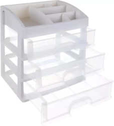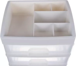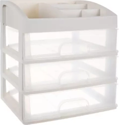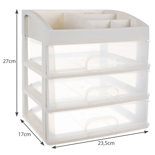 See mitmekülgne korraldaja ühendab selge sorteerimise kompaktse teostusega. Kolm ühesuurust läbipaistvat sahtlit on ideaalsed palettide, pintslite, huulepulkade või ehete jaoks, samas kui ülemine tasapind 6 erineva vahesektsiooniga mahutab pudelid, kreemid ja pisitarvikud. Piimvalge/läbipaistev ilme sobitub elegantselt igasse interjööri.