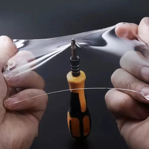 Spetsifikatsioon: Läbipaistev serv, väga vastupidav TPH plastne segu, mõõdud 5 × 500 × 0,04 cm, kaal 169 g, koos pakendiga 171 g.