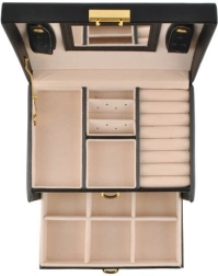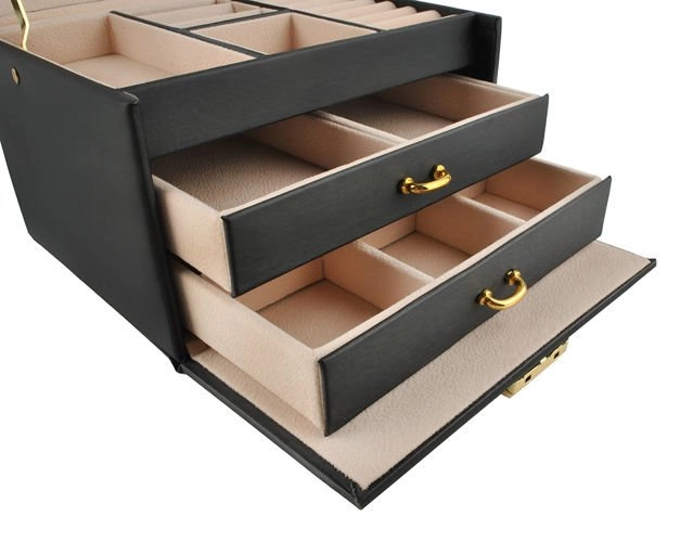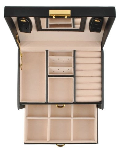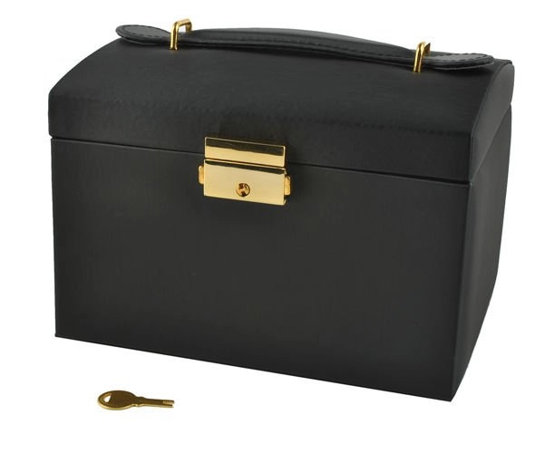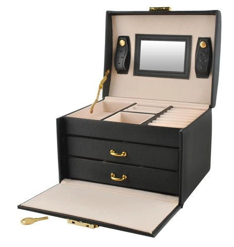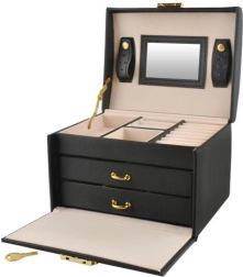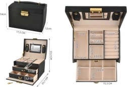 Elegantne mustast PU‑nahast ehtelaegas koos 20 lahtri, 2 sahtli ja peegliga hoiab sinu ehted korrastatult ja turvaliselt. Lukustatav võti ning pehme sametine siseviimistlus kaitsevad ehteid kahjustuste eest, samal ajal kui kuldsed metalldetailid lisavad ajatult luksusliku ilme.