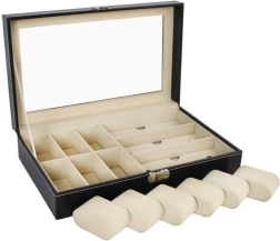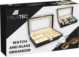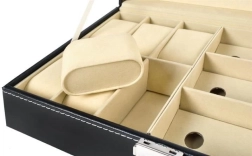 Elegantne must korraldaja valge tikkega ühendab esindusliku välimuse ja praktilisuse. Klaasist kaas võimaldab sisu selget esitlemist, samas kui eraldatud sektsioonid pehme voodriga kaitsevad kelli, prille ja muid ehteid kriimustuste ja soovimatu kokkupuute eest.
