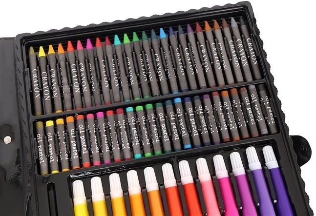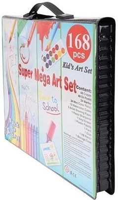 Super Mega Kunstitarvete Komplekt 168 tk pakub kõike, mida vajate kunstiteoste loomiseks: 24 värvipliiatsit, 24 vildikat, 48 õlipastellkreidat, 48 vahapastellkreidat, 12 akvarellvärvi ja palju muud. Kõik tarvikud on elegantselt paigutatud praktilisse vutlarisse, mis tagab lihtsa ligipääsu ja hea ülevaate.