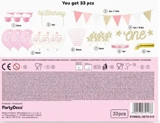 - „One” bänner (1 tk), pabergirland (1 tk), muffinikaunistused (6 tk), hele roosad muffinivormid (6 tk), torditopper (1 tk), kõrred (10 tk), õhupallid, mustrite segu (6 tk), kuldsed serpentiinid (1 tk), satäänpael hele roosa 6 mm (1 tk)