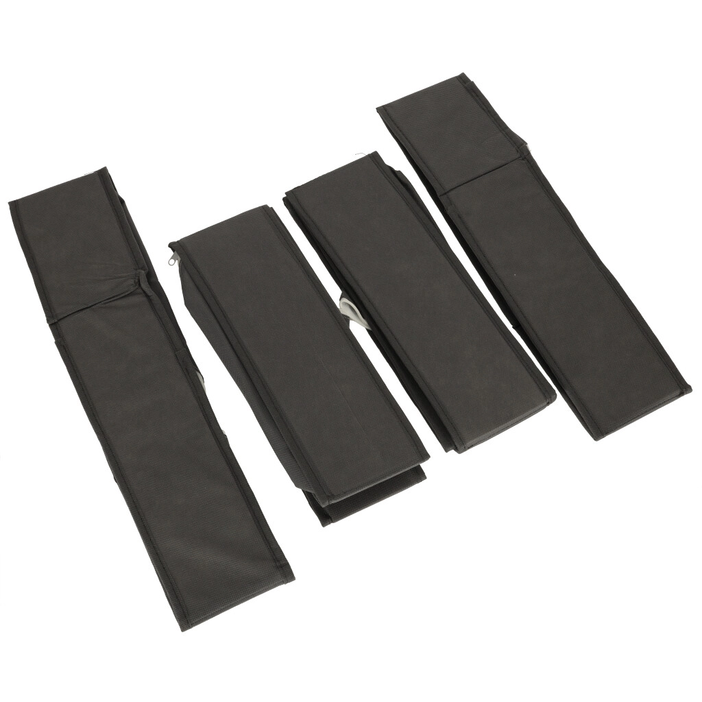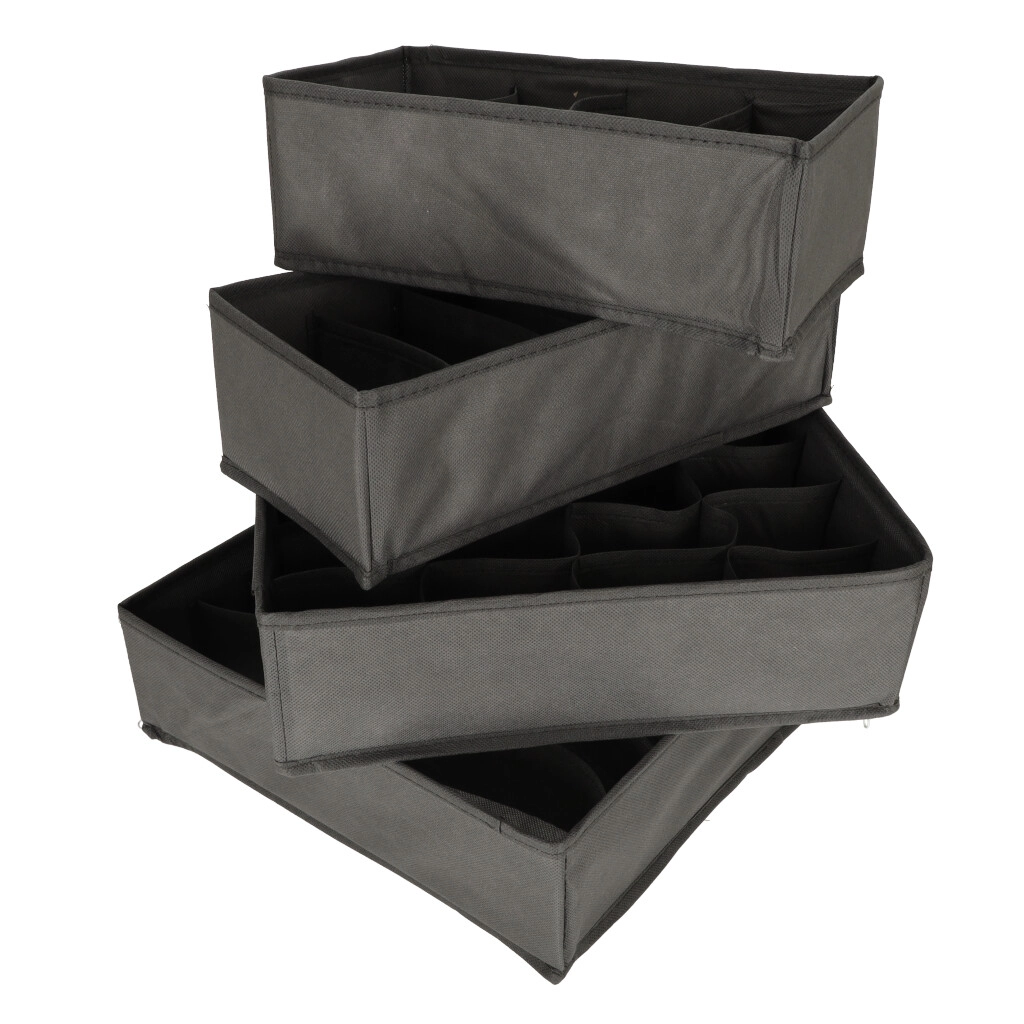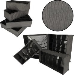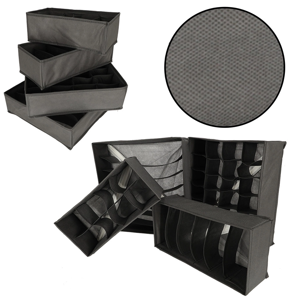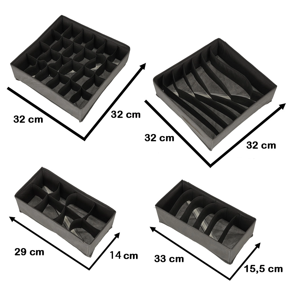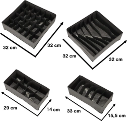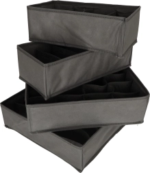Too hetkega kord sahtlitesse. See 4-osaline tekstiilist organiseerijate komplekt erineva lahtrijaotusega jagab selgelt sokid, aluspesu, rinnahoidjad ja aksessuaarid. Tänu pehmele, kuid tugevdatud materjalile hoiavad need kuju, on kergesti puhastatavad ning vajadusel saab need lihtsalt lamedaks kokku voltida ja hoiustada.