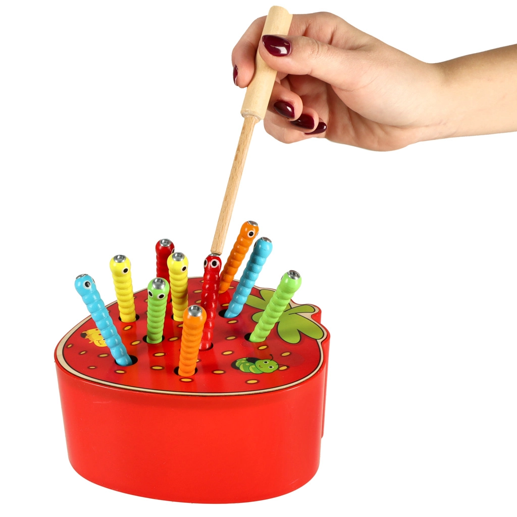 Lõbus puidust motoorikamäng maasika kujul, kus lapsed püüavad magnetpulga abil värvilisi röövikuid. Arendab peenmotoorikat, käe-silma koordineerimist, keskendumist ja kannatlikkust. Turvaline teostus, tugev alus ja pilkupüüdev disain igapäevaseks mänguks.