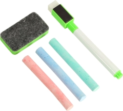 Komplekt sisaldab kõike, mida on vaja alustamiseks: kahepoolne tahvel, umbes 100 magnetit, värvilised kriidid, käsn, vildiga markerid ja kasutusjuhend.