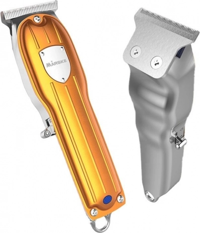 Elegantne kuldne MÄRSKE trimmer täpseks juuste ja habeme hoolduseks. Pakub roostevabast terasest tera, juhtmevaba kasutuse, kiirlaadimise USB kaudu ja 3 kammkinnitust 1–3 mm ideaalselt puhaste joonte ja detailide jaoks.