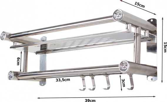 Elegantne hõbedane riputatav vannitoa riiul ühendab ruumika asetuspinna, kaks käterätikupulga ja neli praktilist konksu. Kerge ja vastupidav alumiiniumkonstruktsioon sobib igapäevaseks kasutamiseks ning tänu universaalsele disainile sulandub nii modernsetesse kui ka klassikalistesse interjööridesse.