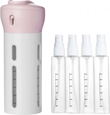 Täitmine on lihtne: keerake ülemine kaas maha, võtke pudelid välja, täitke ja pange tagasi. Pöörates ülaosa valite pudeli, kerge kallutus ja nupu vajutus võimaldab mugavalt doseerida soovitud koguse. Pakendis leiate ka ingliskeelsed sildid selgeks märgistamiseks.