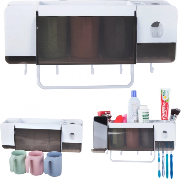 Nutikas vannitoakorraldaja ühendab ühte kompaktsesse lahendusse hoiukohad harjadele, pastale ja kosmeetikale. Automaatne hambapastadooser muudab igapäevase hügieeni lihtsamaks, samas kui lisatarvikute sahtlid mahutavad kreemid, meigipintslid või deodorandid. Kolm vastupidavat plasttassi (300 ml) sobivad suurepäraselt kogu perele.