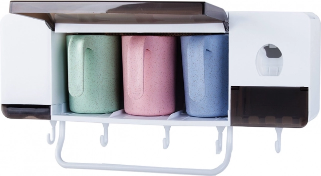 Hoia vannituba laitmatult korras selle seinale paigaldatava hambaharja ja -tasside korraldajaga, millel on sisseehitatud hambapastadooser. See pakub praktilisi kosmeetikasahtleid, 3 tassi mahuga 300 ml, konksukesi harjade jaoks ning lihtsat seinale paigaldust vaakriga. Tugev konstruktsioon kandevõimega kuni 5 kg ja integreeritud rätikuhoidja tagavad korra ja hoiavad ruumi kokku.