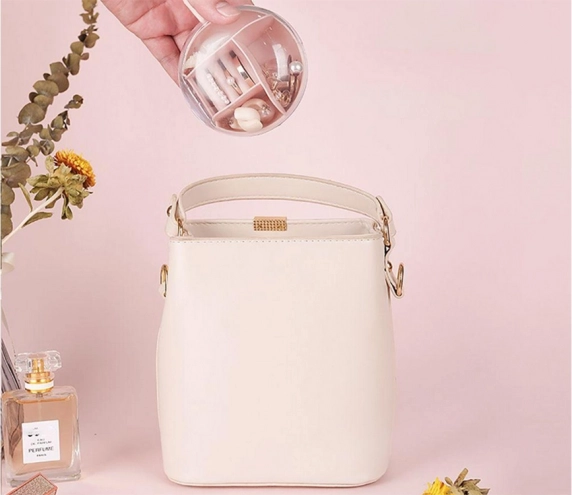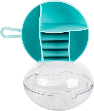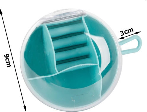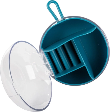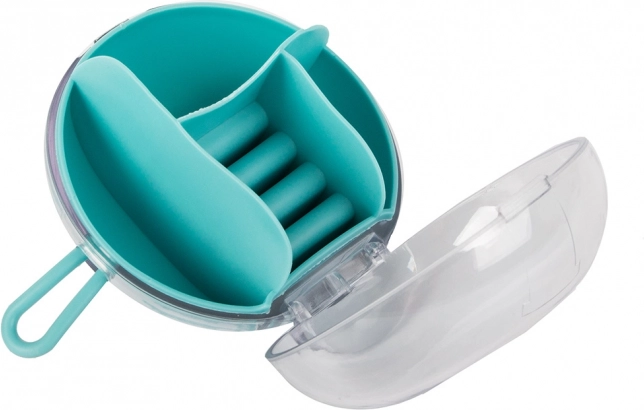 Eemaldatava keskse korraldaja tänu saab osa lahtritest kasutada ka eraldi. Kompaktsed mõõtmed – läbimõõt 9 cm ja kõrgus 6 cm – teevad sellest ideaalse valiku käekotti, kohvrisse või tualettlauale. Saadaval värvid: roosa, tumesinine, roheline.