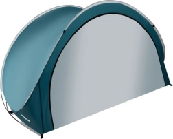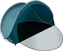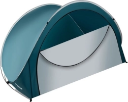 Topeltlukk võimaldab sissepääsu osaliselt või täielikult sulgeda, nii püsivad asjad sees ilma liiva ja tolmuta. Vastupidav polüester ja stabiilne klaaskiust raam tagavad töökindluse tuules, komplektis on vaiad, pingutusnöörid ja kandekott transportimiseks.