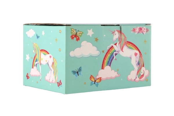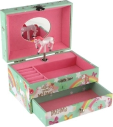 Võluv ükssarviku motiiviga pastellroheline muusikaline ehetekarp rõõmustab iga väikest ilmatari. Pärast võtme keeramist hakkab sees ükssarviku figuur pöörlema ning kõlab õrn meloodia. Seest leiab peegli, selged lahtrid ja praktilise sahtli pisikeste aardete jaoks. Vastupidav kartongkorpus, metallosad ja kaunid vikerkaare, tähtede ja liblikate illustratsioonid sobivad suurepäraselt lastetuppa.